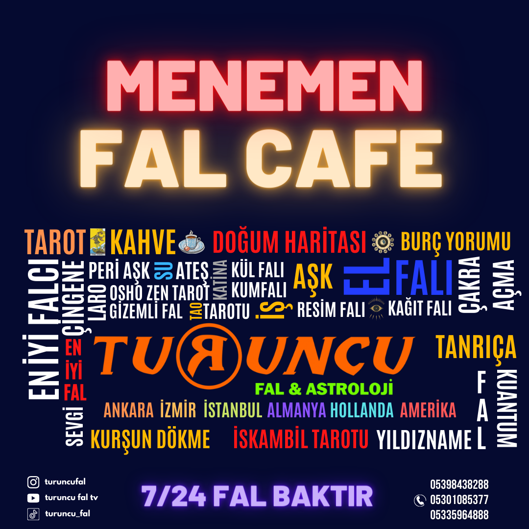 80’den fazla fal çeşidi ve 50’den fazla falcı güvenle fal baktırabilirsiniz. Menemen fal cafe, Türkiye’nin en büyük fal ve astroloji merkezidir. Fal ve astroloji merkezimize dilerseniz online olarak7/24 günün her saatinde fal baktırabilirsiniz. Dilerseniz cafemize gelip yüz yüze fal baktırabilirsiniz.